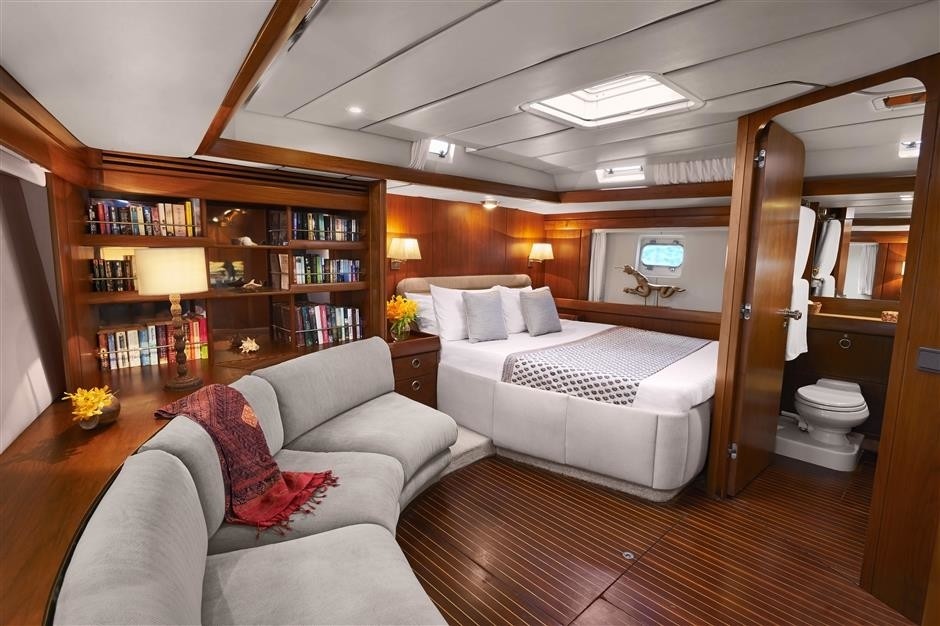 The main companion way leads from the salon into the guest cockpit with wrap around seating and a leafed alfresco dining table. Further aft the helm cockpit offers further seating, both cockpits have optional shade if required. LETEZIA has wide decks, when not under sail the foredeck is perfect for sunning or simply relaxing.