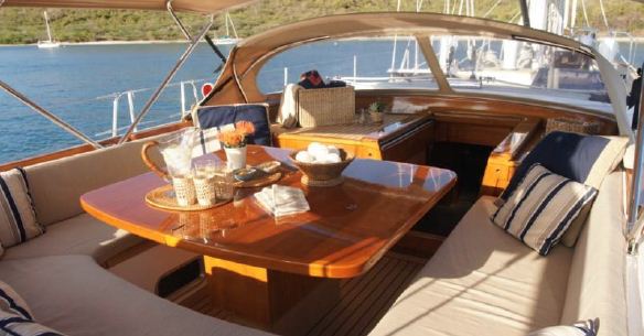 The main companion way leads from the salon into the guest cockpit with wrap around seating and a leafed alfresco dining table. Further aft the helm cockpit offers further seating, both cockpits have optional shade if required. LETEZIA has wide decks, when not under sail the foredeck is perfect for sunning or simply relaxing.
