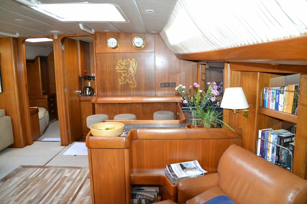 The salon features a formal dining area on the port side with a large U shaped sofa, ideal for lounging. On the starboard side there is a breakfast bar facing the galley forward, an entertainment center and 2 plush leather occasional chairs, allowing everyone a place to retreat.