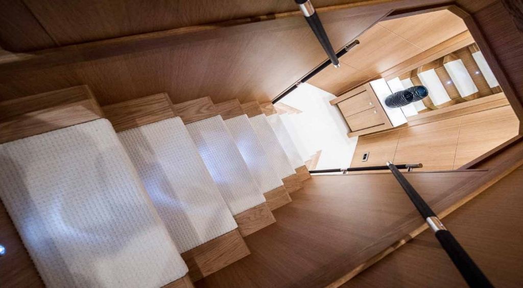 The master stateroom is forward on the main deck and boasts a full beam layout, center lined double bed, love seat, vanity, walk in wardrobe and beautifully finished en-suite facilities. A further 4 cabins are on the lower deck and are 2 double and 2 twin configuration, one of the twin cabins can convert into a double if required.