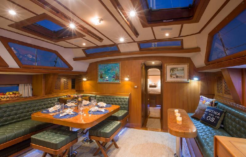 The salon is an open plan on yacht VOO DOO, with ample natural light from overhead hatches and side ports, the feel is incredibly generous. On the port side, a formal dining area seats 4 guests easily on a built in L shaped sofa and ottoman seats, on the starboard side, a further sofa and cocktail table is perfect for relaxing with a book.