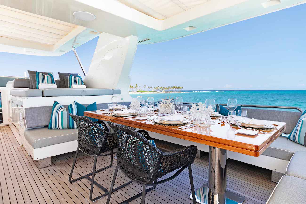 Stepping out from the salon the aft deck is shaded and features a comfortable alfresco dining option and ample seating. She offers a fabulous range of water toys easily accessed from the extended swim platform on the transom. The foredeck boasts 2 large sunpads.