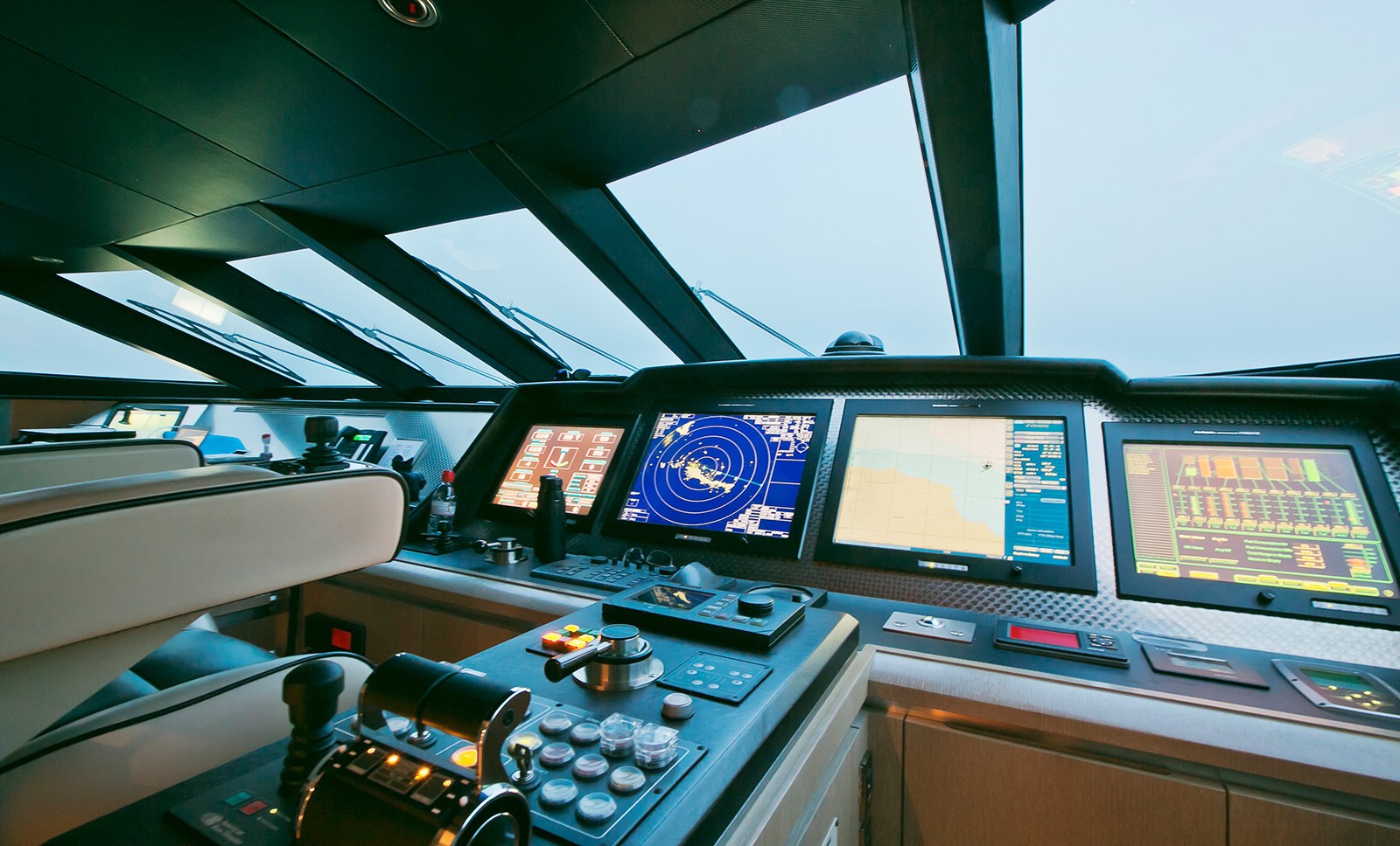 She offers plenty of exterior living areas. The aft deck boasts an alfresco dining option, cocktail/lounge seating, and a massive sun pad. Gradual broad steps on port and starboard lead to the extended swim platform.