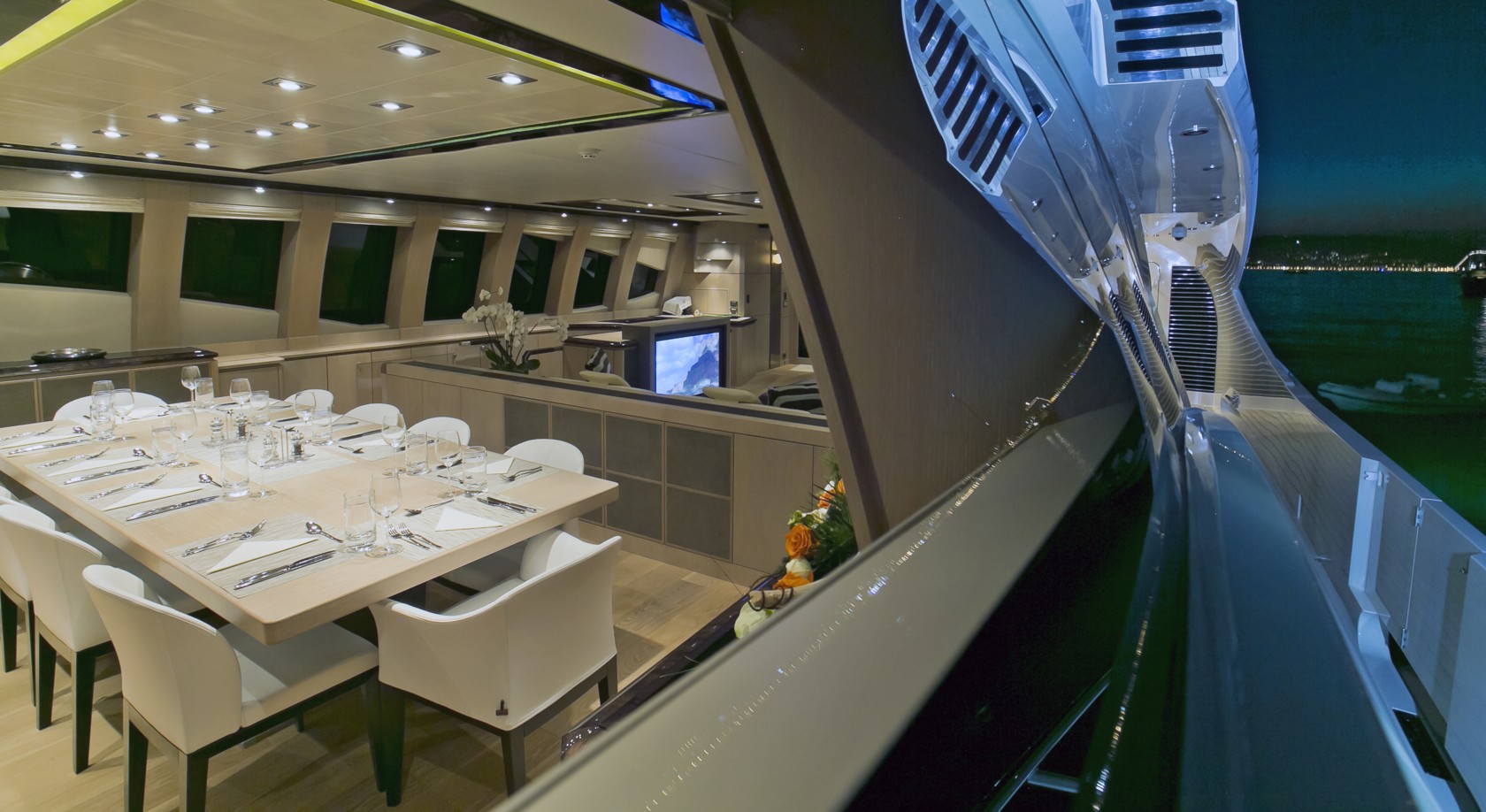 The aft deck boasts an alfresco dining option, cocktail/lounge seating, and a massive sun pad. Gradual broad steps on port and starboard lead to the extended swim platform. Above the main deck, the sundeck has two large sun pads and a deluxe Spa Pool tub.