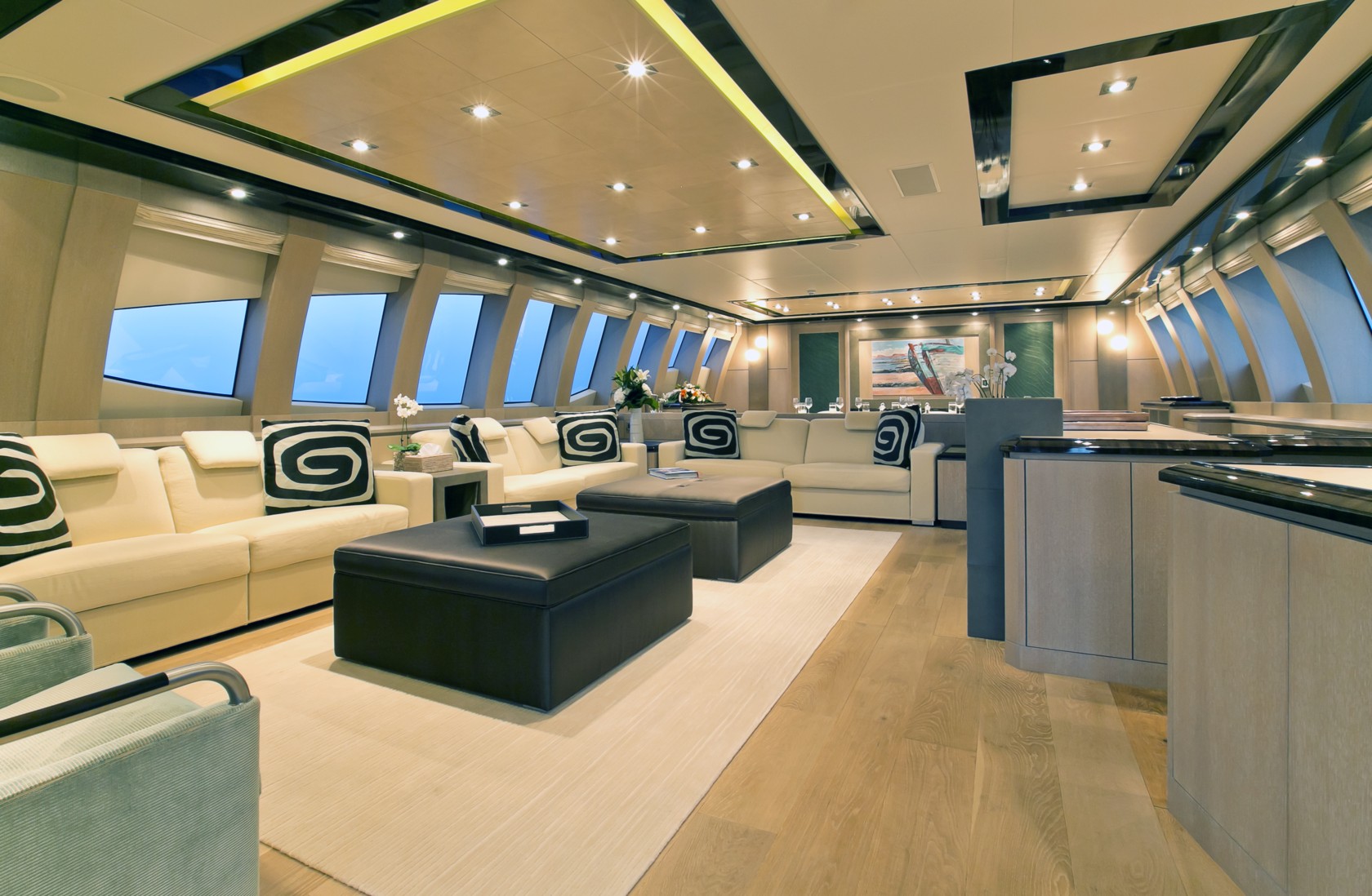 The salon is light and airy, giving the impression that everything is in its place, from the well-appointed leather furnishings to the ease of contrast between light and dark woods, making the space incredibly generous while still feeling very relaxed.