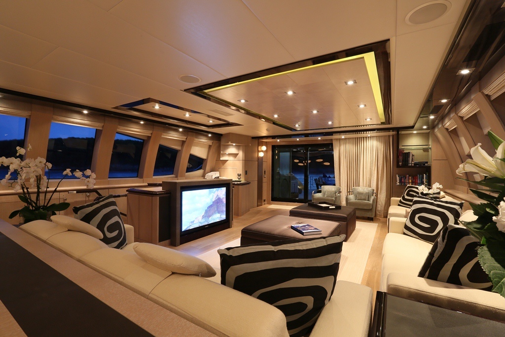 A large flat screen TV boasts satellite entertainment, guests wishing to stay in touch can do so with the latest hi-speed internet available throughout the yacht. Forward of the lounge a formal dining table seats ten guests comfortably.