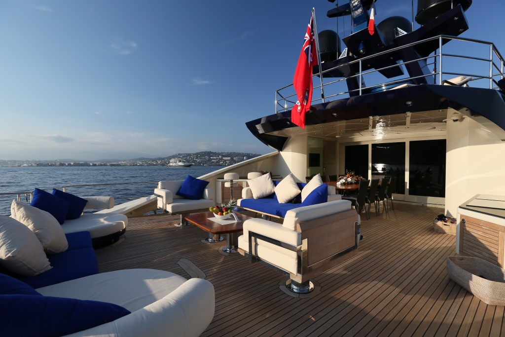 The aft deck boasts an alfresco dining option, cocktail/lounge seating, and a massive sun pad. Gradual broad steps on port and starboard lead to the extended swim platform. Above the main deck, the sundeck has two large sun pads and a deluxe Spa Pool tub.