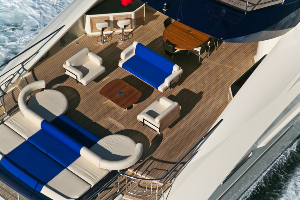 The aft deck boasts an alfresco dining option, cocktail/lounge seating, and a massive sun pad. Gradual broad steps on port and starboard lead to the extended swim platform. Above the main deck, the sundeck has two large sun pads and a deluxe Spa Pool tub.
