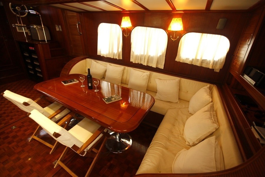 The master cabin is full beam of the yacht aft with a center lined double bed and 2 sofas, windows on 3 sides bring in plenty of natural light. A VIP cabin is forward and full beam of the yacht with a center lined double bed. The double guest cabin has a double bed and sofa and the twin cabin has 2 single side by side beds.