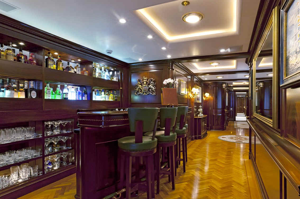 The Foyer offers a Large wet bar with stools and there is a powder room forward. She has an observation area with a seating & sunning area. The Spa and Gym has tread-mills and bikes, a stair Master, and weight machines. The yacht’s Spa deck aft also has a Spa Pool pool that can convert into a table for up to 24 guests.
