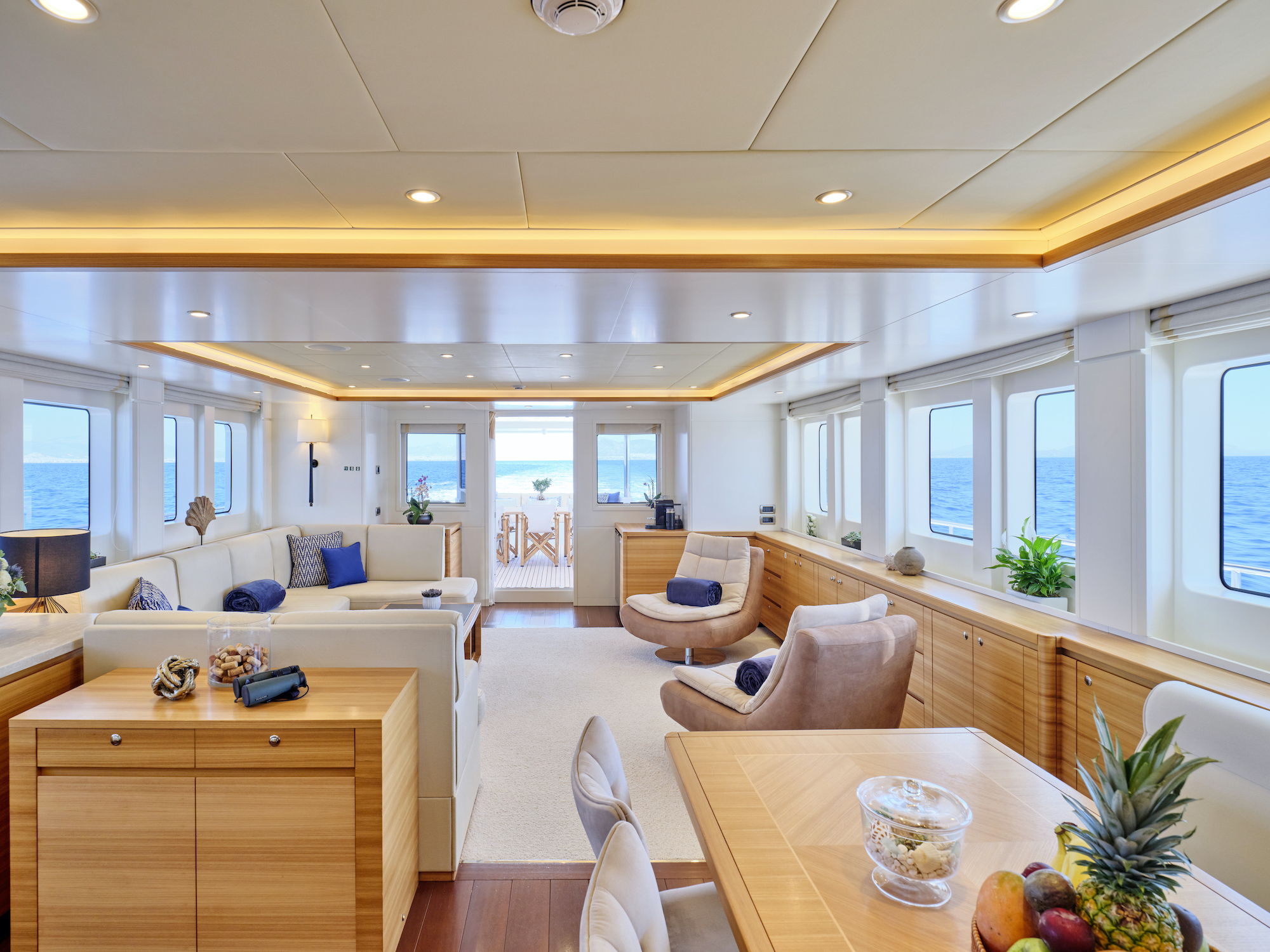 Accommodation includes one full-beam master suite with an ensuite head, one forward VIP cabin with queen bed and ensuite bathroom and two twin cabins with two single beds, one pullman bed and ensuite bathroom. All cabins have custom linen and towels.