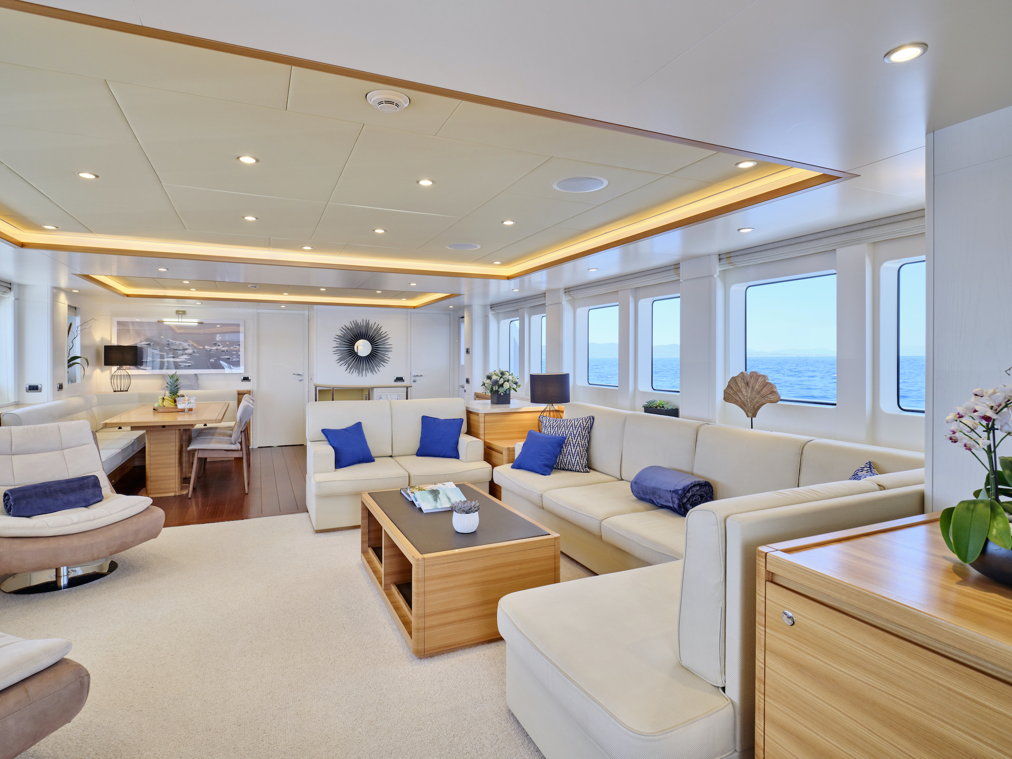 Accommodation includes one full-beam master suite with an ensuite head, one forward VIP cabin with queen bed and ensuite bathroom and two twin cabins with two single beds, one pullman bed and ensuite bathroom. All cabins have custom linen and towels.