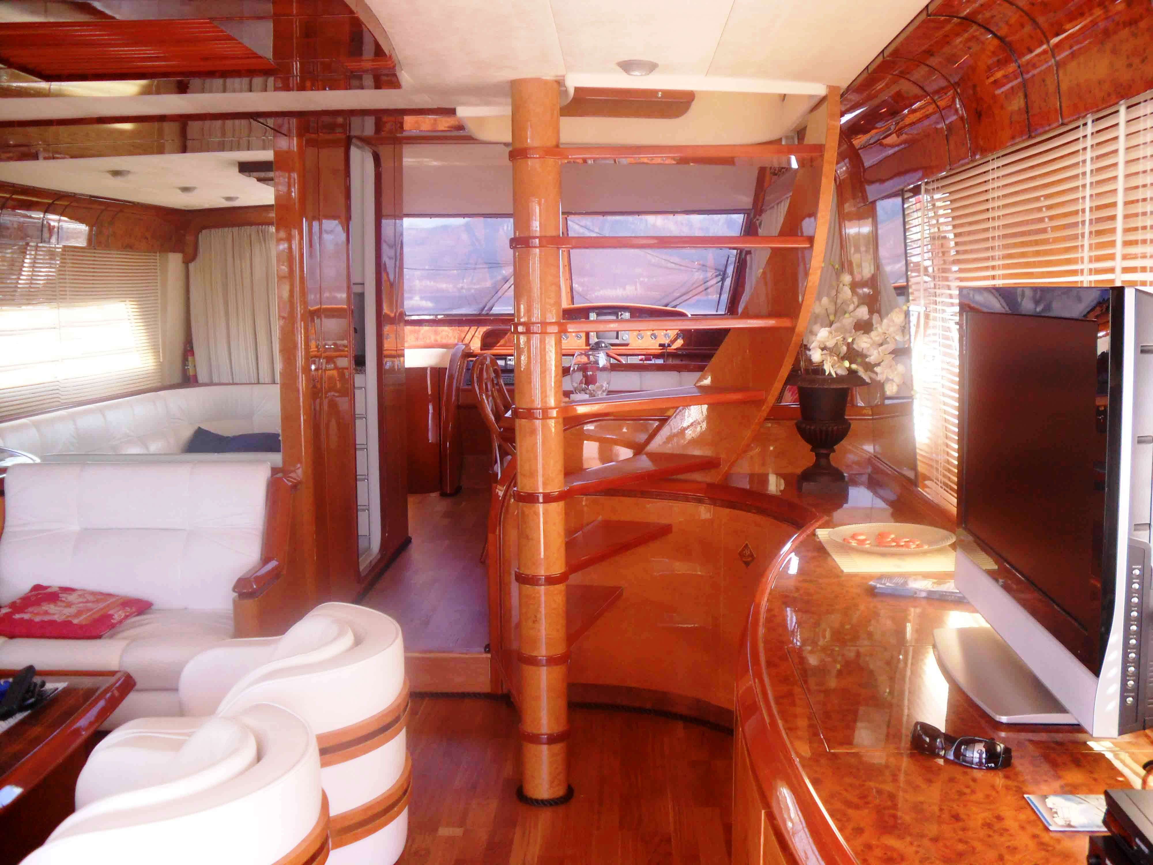 The salon is generous and features comfortable sofas, occasional chairs, coffee table and full entertainment systems. Forward of the salon, is the formal dining area, easily seating 8 guests in style. An eye catching spiral staircase leads to the upper sun deck from the interior salon.