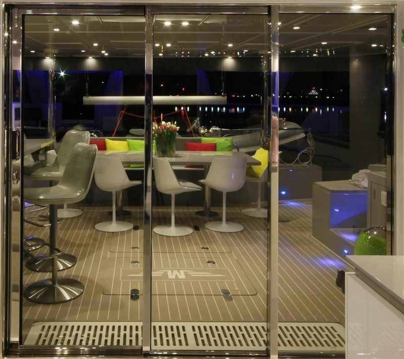 The master stateroom is forward in the starboard hull with a king size bed and en-suite facilities with a tub. A VIP cabin is forward in the port hull with a king size bed, a guest double cabin is aft of the master on the starboard side with a king size bed and small Pullman berth, perfect for a child.