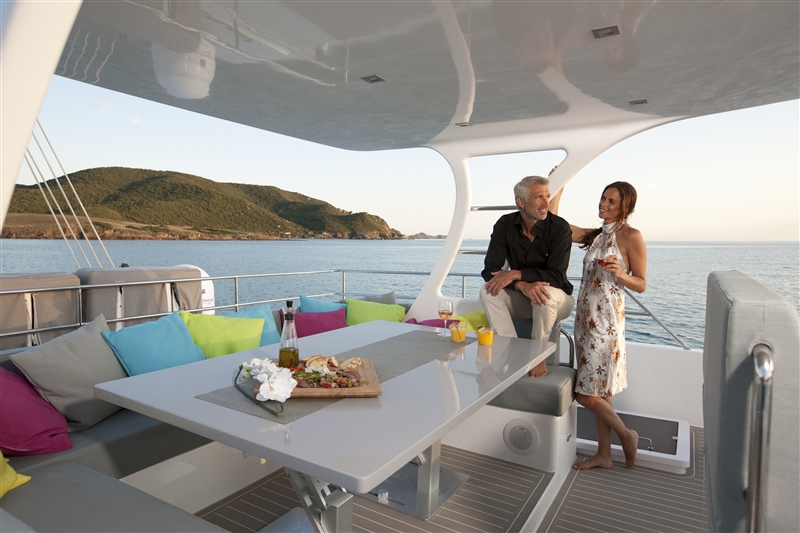 There is a full-beam flybridge and helm station with optional shade, a further alfresco dining table and large sunpads, the table cleverly converts into another sunpad, creating a superior sunning area.