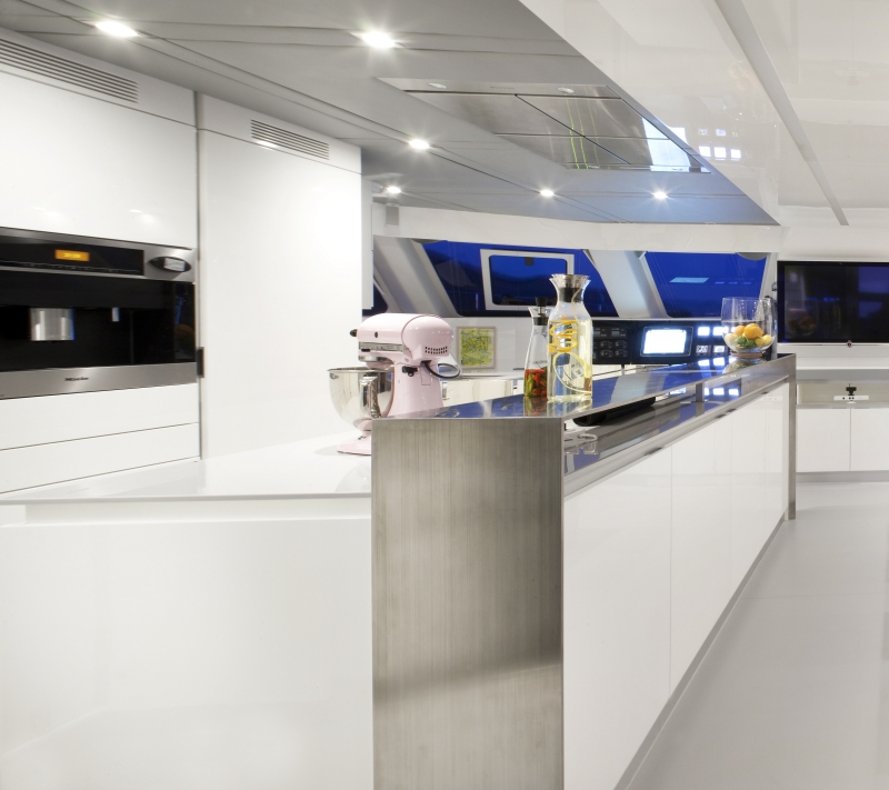 A combination of comfort and elegance are key throughout the S/Y MAVERICK’s decor, the salon features a plush sofa, formal dining table and galley with breakfast bar.