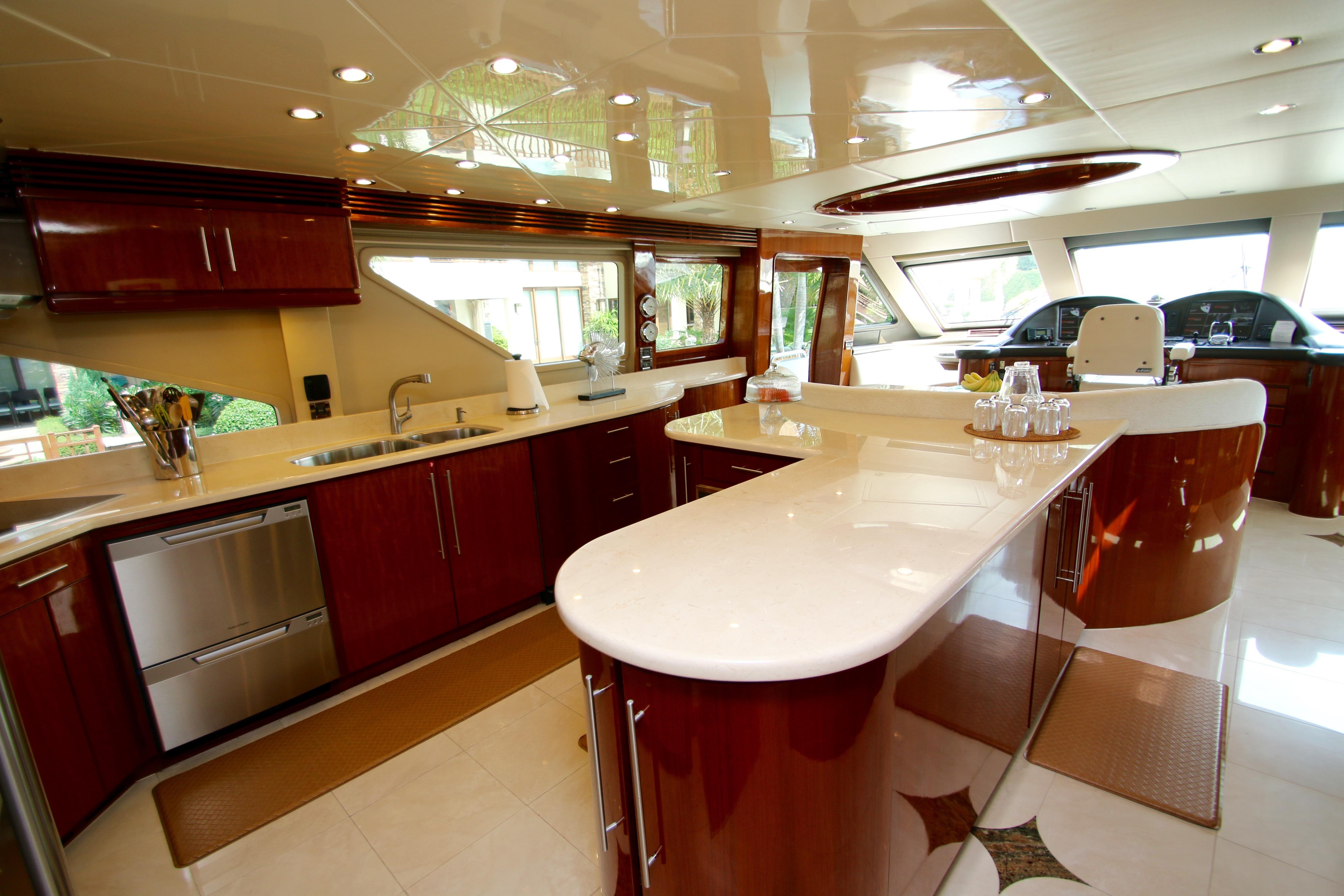 Further forward a hall leads to the large open style galley, a small seating area with table and helm station.