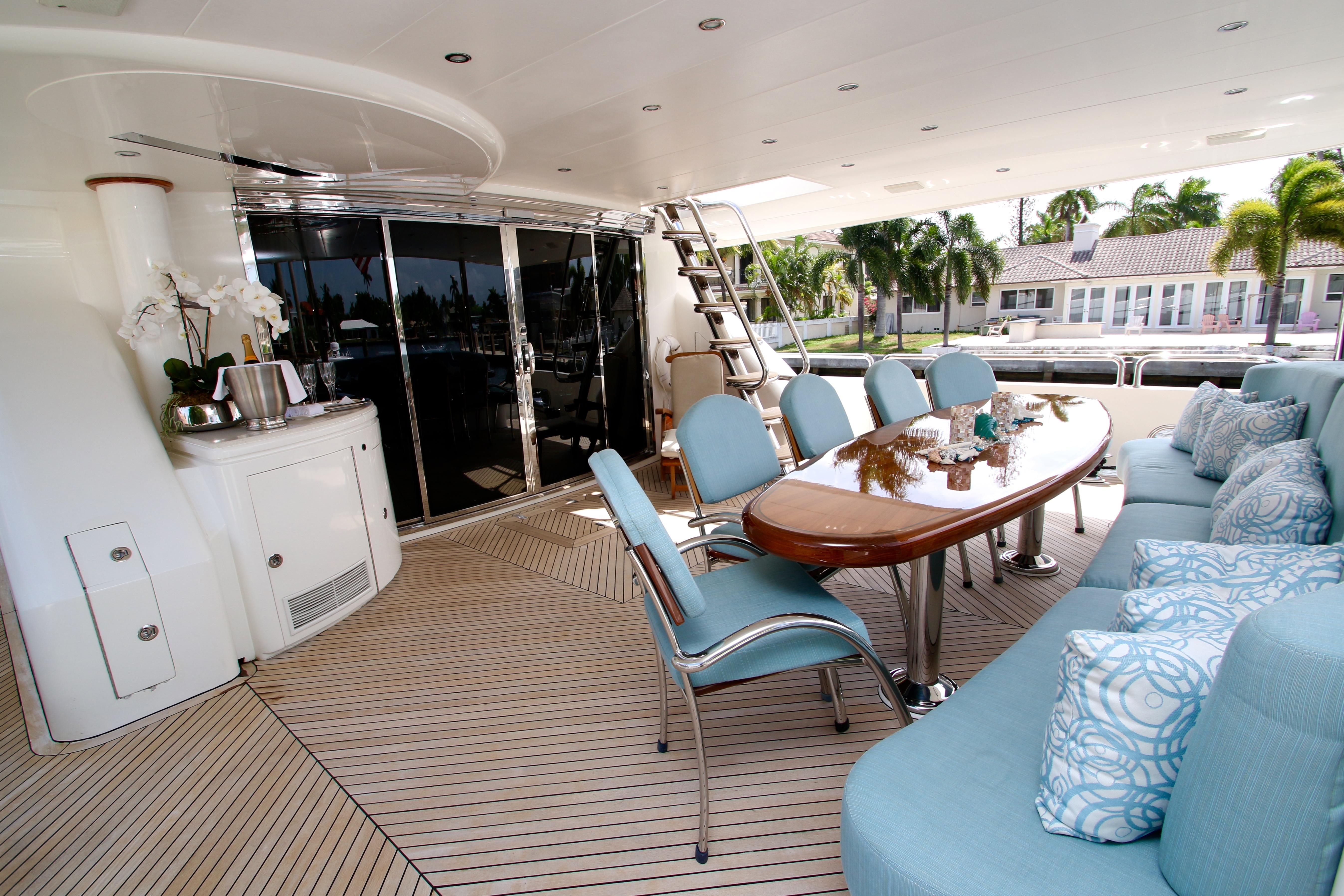 The aft deck is shaded and offers an alfresco dining option, additional built in seating area and drop down TV. Further aft, the full beam extended swim platform was designed with easy access wide steps and stainless hand rails for added safety.