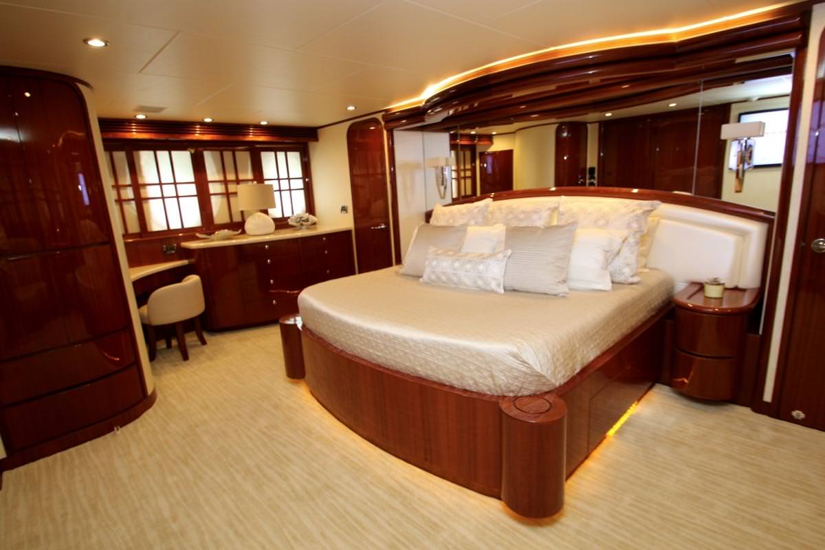 The master suite is amidships with a center lined bed, vanity, sofa, walk in wardrobe and en-suite facilities with his and hers sinks and large shower. The VIP cabin is forward and on the port side with a walk around double bed and en-suite facilities.