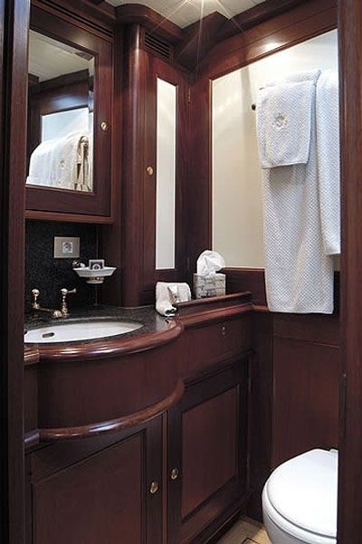 Luxury sail boat Shamoun’s saloon is extremely spacious and boasts a bar as well as a state of the art cinema! Guests can eat in the raised pilot house to enjoy the panoramic views of the charter location whilst remaining in the comfort of the yacht’s traditional interior.