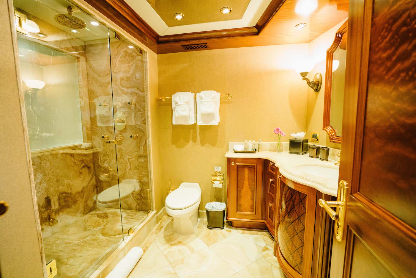 The main salon is spacious offering an L shaped sofa and occasional chairs in a cool grey tone, an island credenza offers a retractable TV and gives an elegant yet casual separation to the formal dining area forward. To starboard, a marble hall leads to the master cabin, which offers a king-size bed, private study and his and hers facilities.