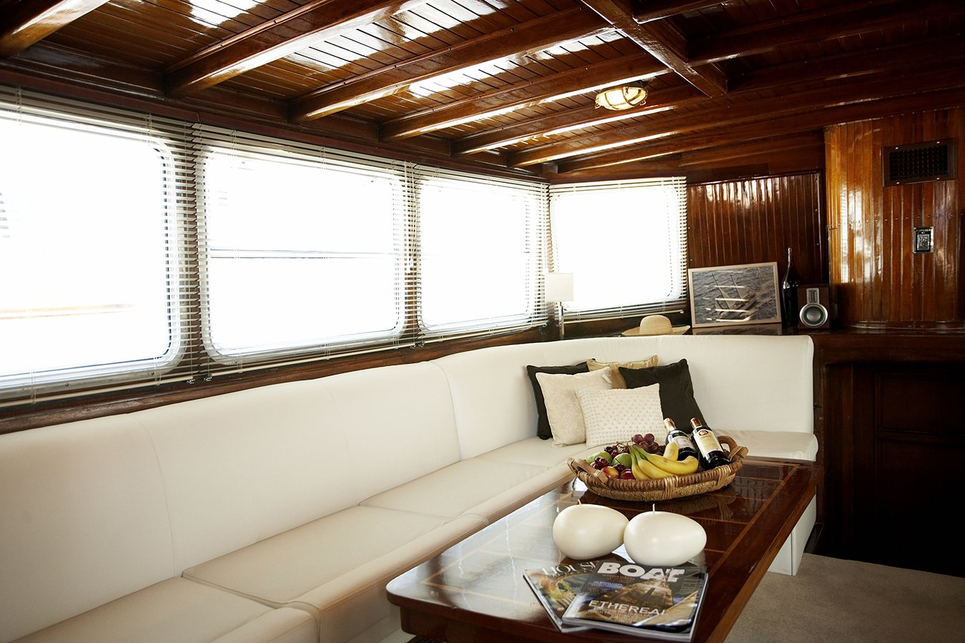 The salon is raised in the deck house and features 2 large white leather sofas, coffee table, ottomans and full entertainment with satellite TV. Large surroundings windows allow ample natural light to infuse the space creating a warm spacious atmosphere.
