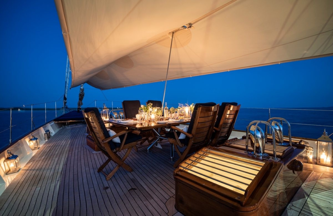 The yacht can accommodate up to 9 charter guests, in 4 cabins and has a professional crew of 5.