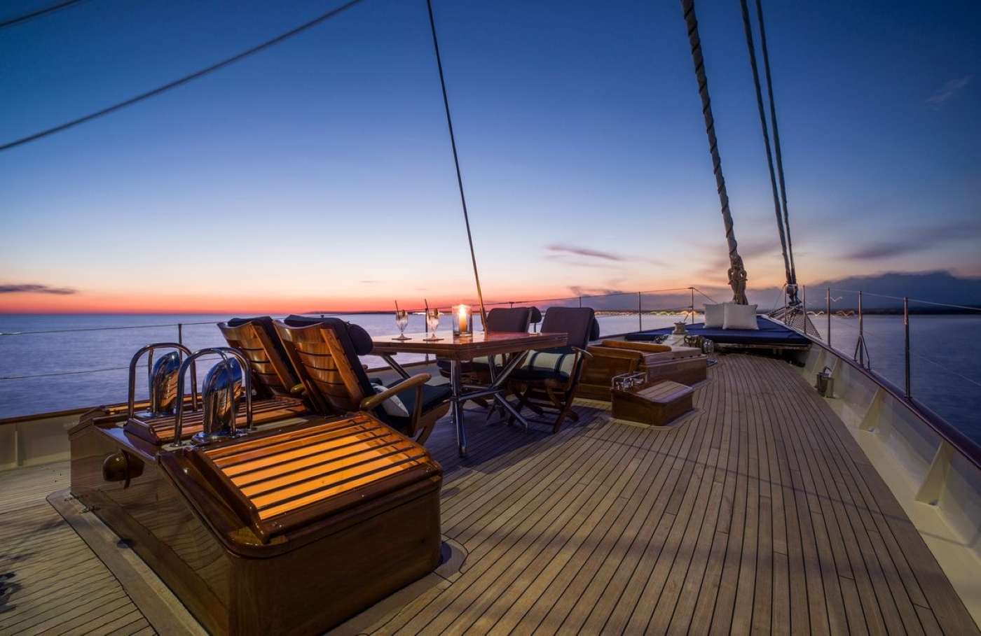 The yacht can accommodate up to 9 charter guests, in 4 cabins and has a professional crew of 5.