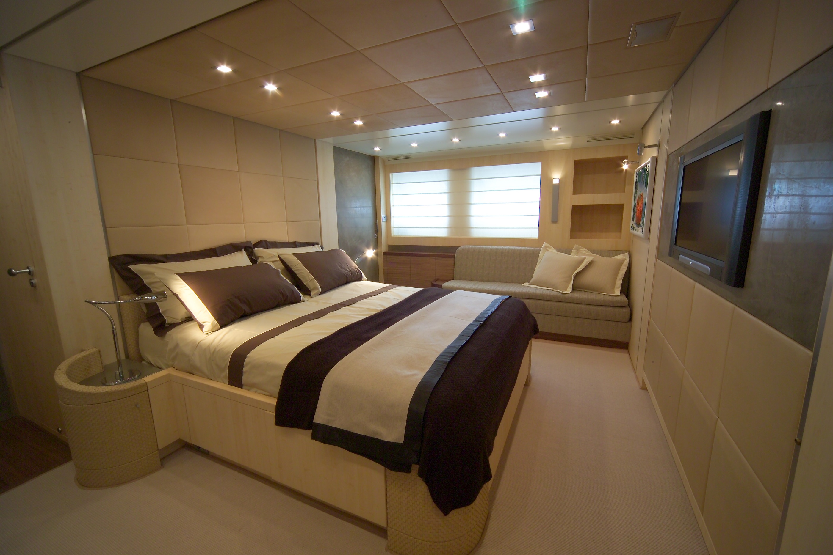 Below decks, the GEORGE P motor yacht has a neutral casual atmosphere. The salon is an open plan with the formal dining on the port side and a sofa to starboard.