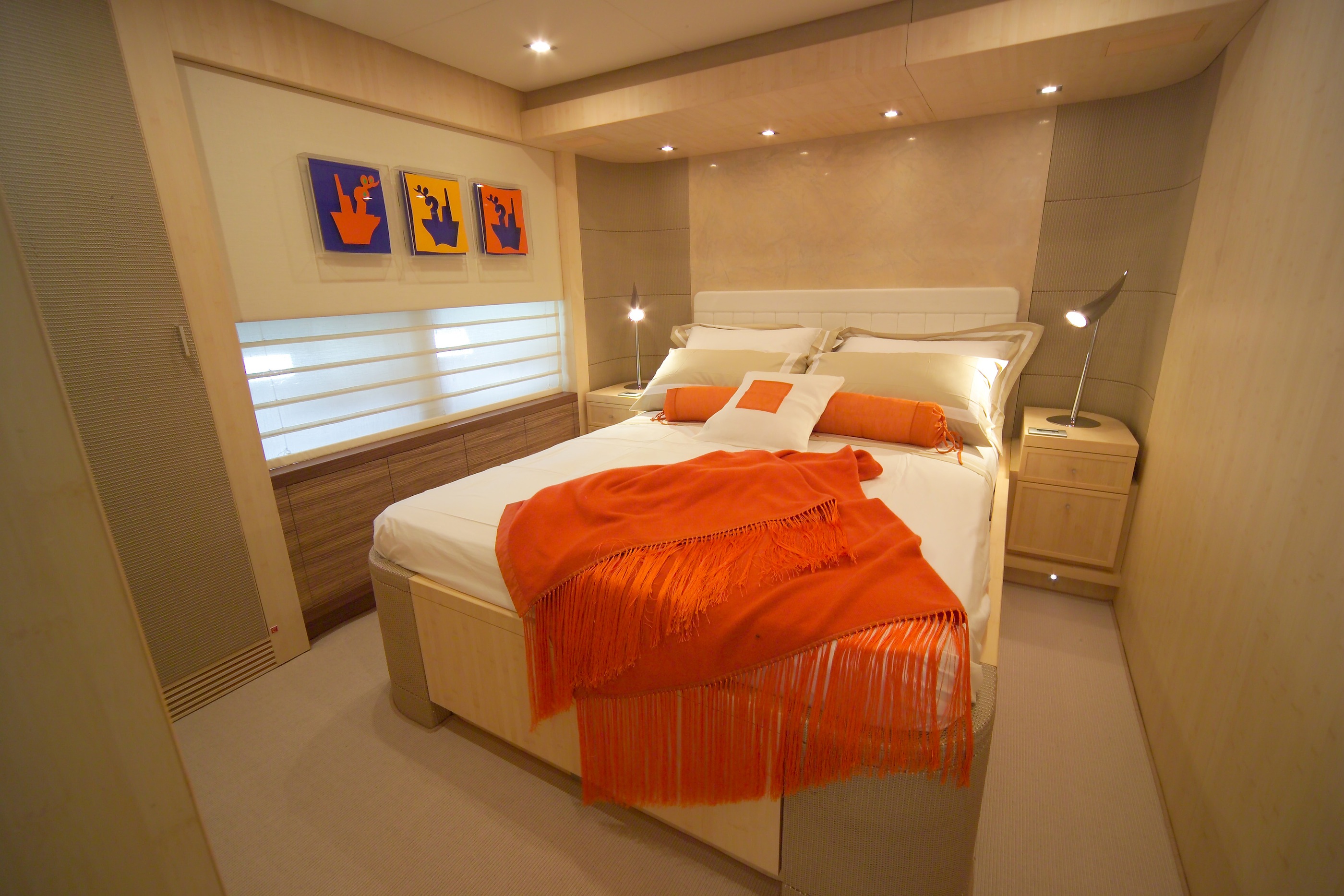 Below decks, the GEORGE P motor yacht has a neutral casual atmosphere. The salon is an open plan with the formal dining on the port side and a sofa to starboard.