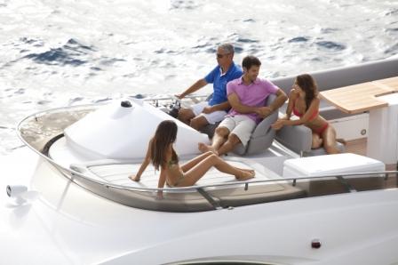 Above on the flybridge, is a further alfresco dining option and sunpad.