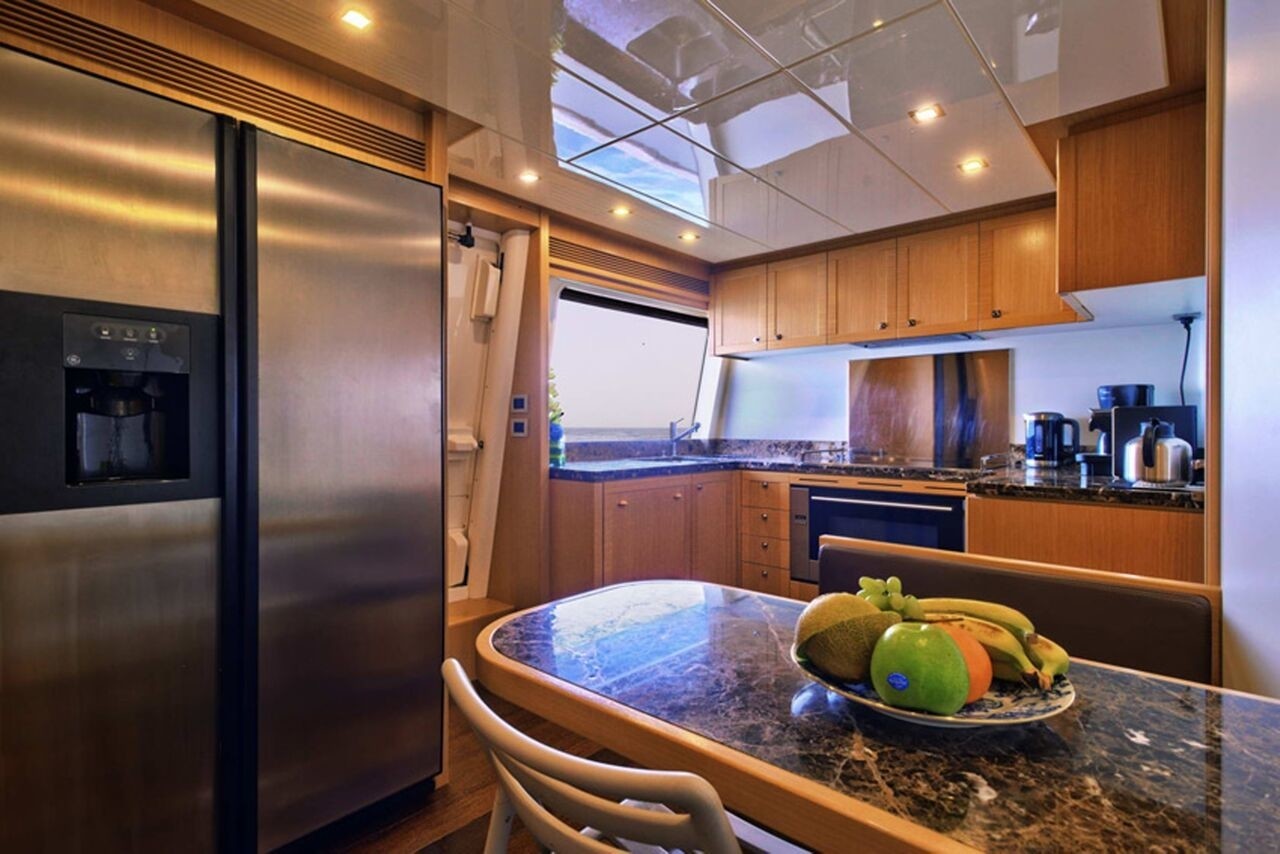 The salon and dining is an open plan and features rich coffee toned dark wood floors, light honey wood panels and cream ceilings. The lounge space is aft with a large leather L shaped sofa, love seat and ottoman on the starboard side, too port, guests will find a state of the art entertainment system.