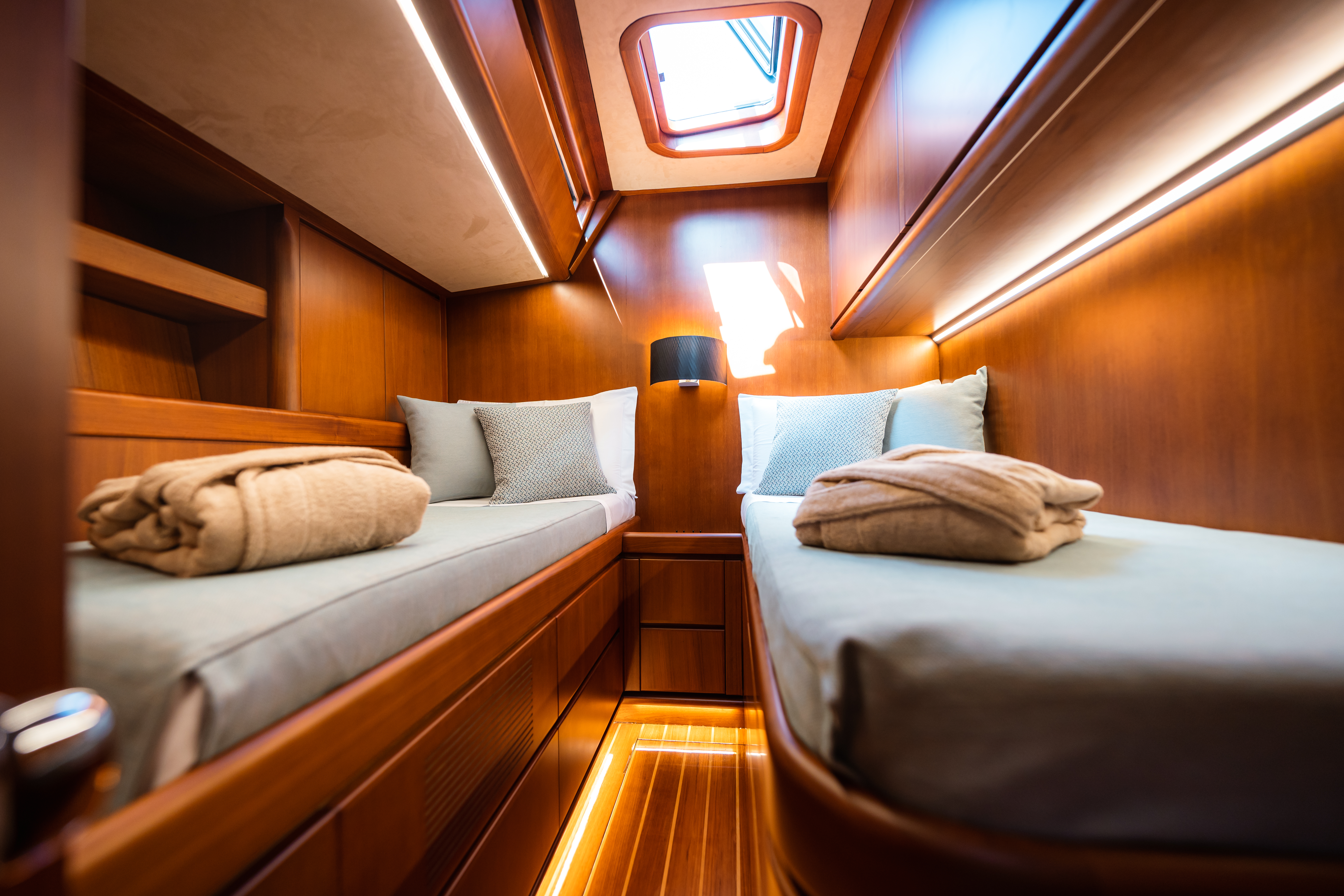 Her abundant deck space, open cockpit and luxury interior can welcome up to six guests who will be accommodated in three suites.