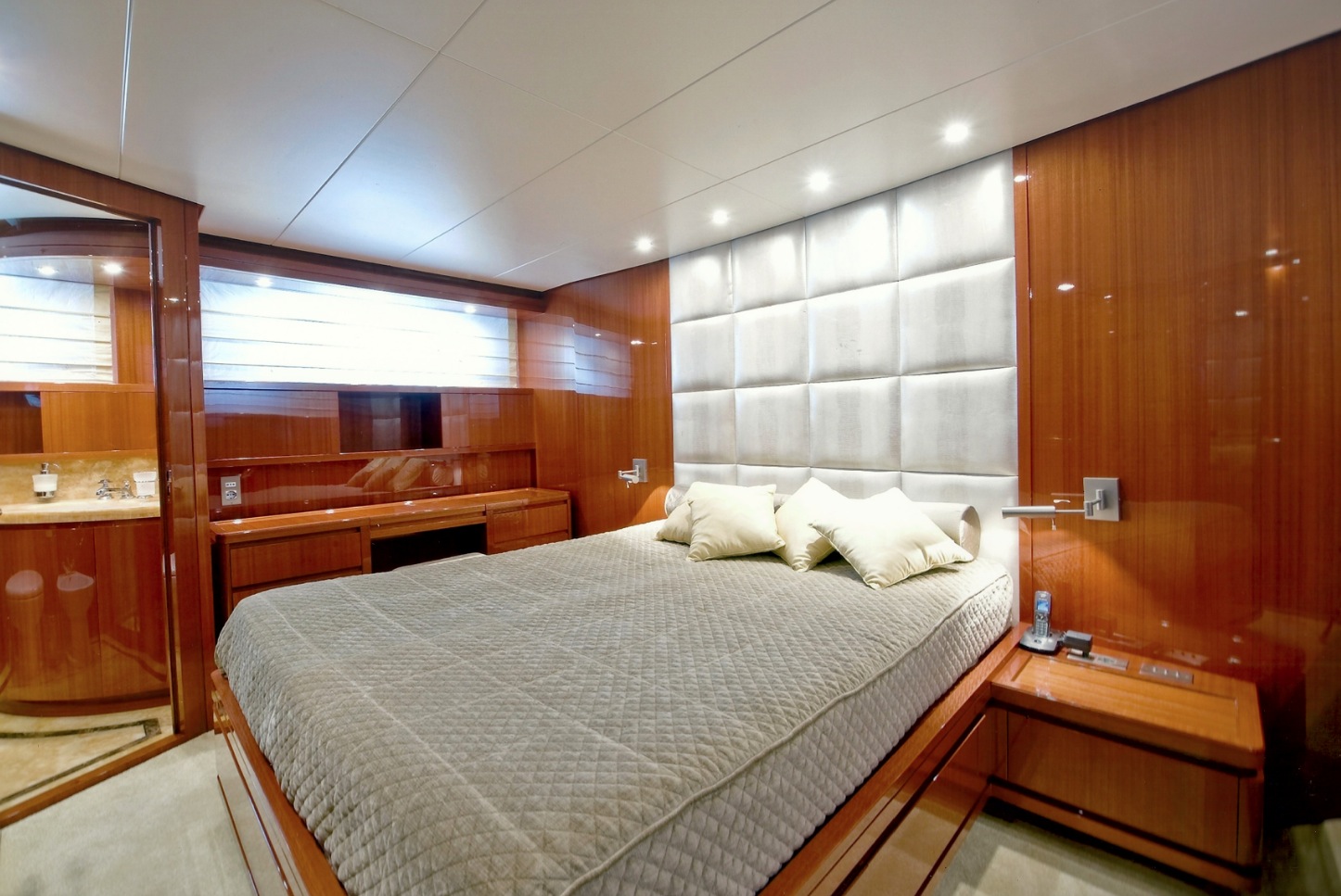 Motor yacht GPS has a refined elegant interior, featuring high gloss African Cherry wood panels throughout. The décor is contemporary and neutral, boasting relaxing earthy tones.