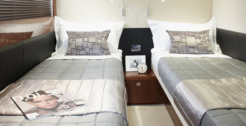 Luxury Princess V78 yacht ARAMIS can accommodate up to 8 charter guests, offering 2 double and 2 twin cabins, all with en-suite facilities. The master suite is amidships and full beam of the yacht, with a center lined double bed, day bed and vanity. The VIP cabin is forward and full beam of the yacht, with a center lined double bed.