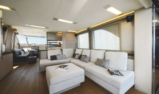 She boasts a contemporary interior of soft neutral tones throughout, creating a serene balanced atmosphere. The salon and dining are an open plan with the lounge aft.