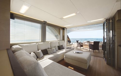 She boasts a contemporary interior of soft neutral tones throughout, creating a serene balanced atmosphere. The salon and dining are an open plan with the lounge aft.