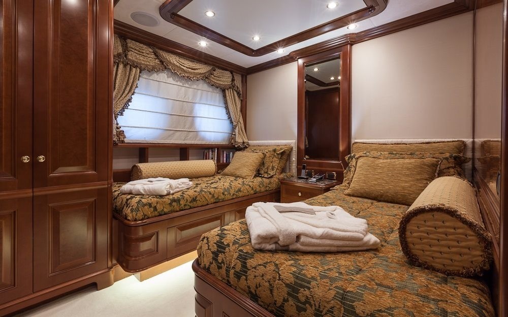 She is run by twin Caterpillar C32 diesels, delivering her a top speed of 14 knots and a cruising speed of 12.5 knots. Her beam is of 9,50m (31'17'') and her maximum draught is of 2,60m (8'53''). A total number of 12 charter guests can find utmost luxury aboard PRIDE, in 6 beautifully appointed cabins.