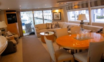 The salon and dining are an open plan, with a comfortable lounge aft featuring a large L shaped sofa, 2 occasional chairs, coffee tables and full entertainment center. Forward, the formal dining space seats 6 guests in true style.