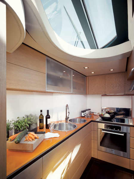 A full entertainment system and pop up TV is available on the port side. Elongated side windows, retractable sunroof and wide sliding glass doors create a fabulous social ambiance, leading directly onto the spacious aft deck.
