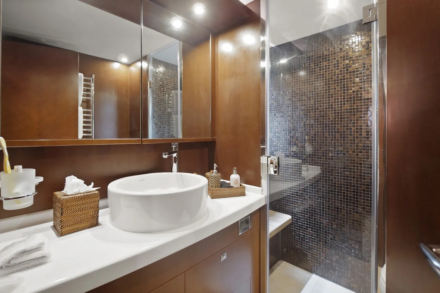 Below decks, luxury motor yacht 21 SEA SANDS offers accommodation for up to 8 charter guests. The master suite is amidships and full beam of the yacht with a center lined king size bed, sofa and vanity. Forward, the VIP cabin boasts a full beam layout and queen size center lined bed, sofa and vanity.