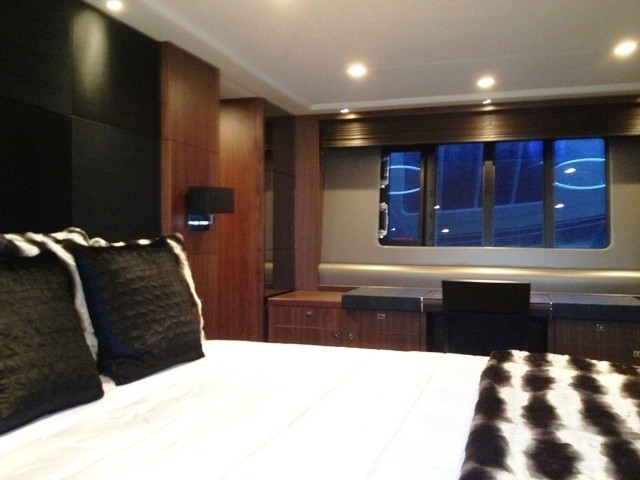 Charter yacht PANTHERA COVE has a modern elegant interior, featuring rich dark wood panels, crisp white soft furnishings and tranquil cool finishes. The salon and dining boast an open and airy ambiance with 2 sofas, a coffee table and full entertainment aft and formal dining forward.
