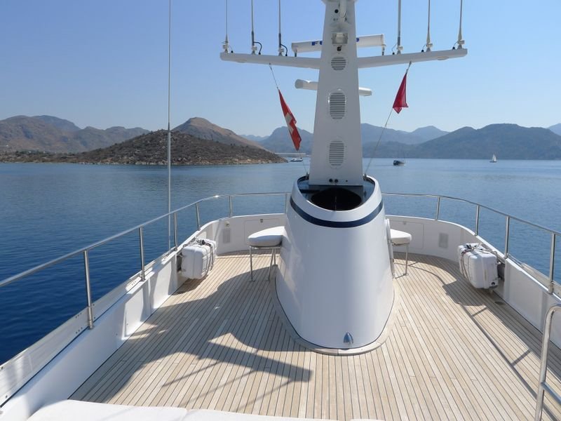 Motor yacht MIZAR features 2 levels of fine teak decks for guests to enjoy. The salon leads out onto a shaded aft deck, complete with an alfresco dining option and seating, perfect for entertaining.