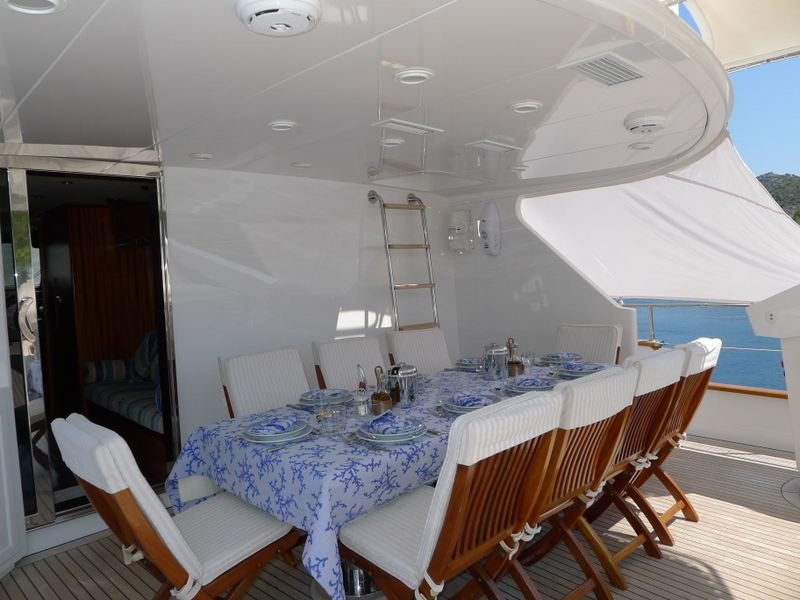 Motor yacht MIZAR features 2 levels of fine teak decks for guests to enjoy. The salon leads out onto a shaded aft deck, complete with an alfresco dining option and seating, perfect for entertaining.