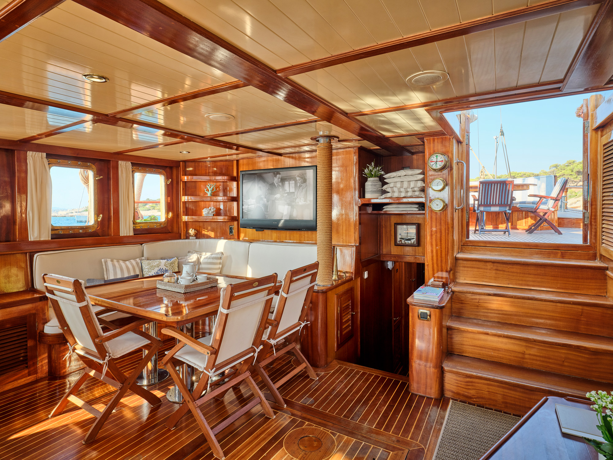 Aboard MYRA, the salon is in the raised deck house, large ports allow ample natural light and great viewing.
