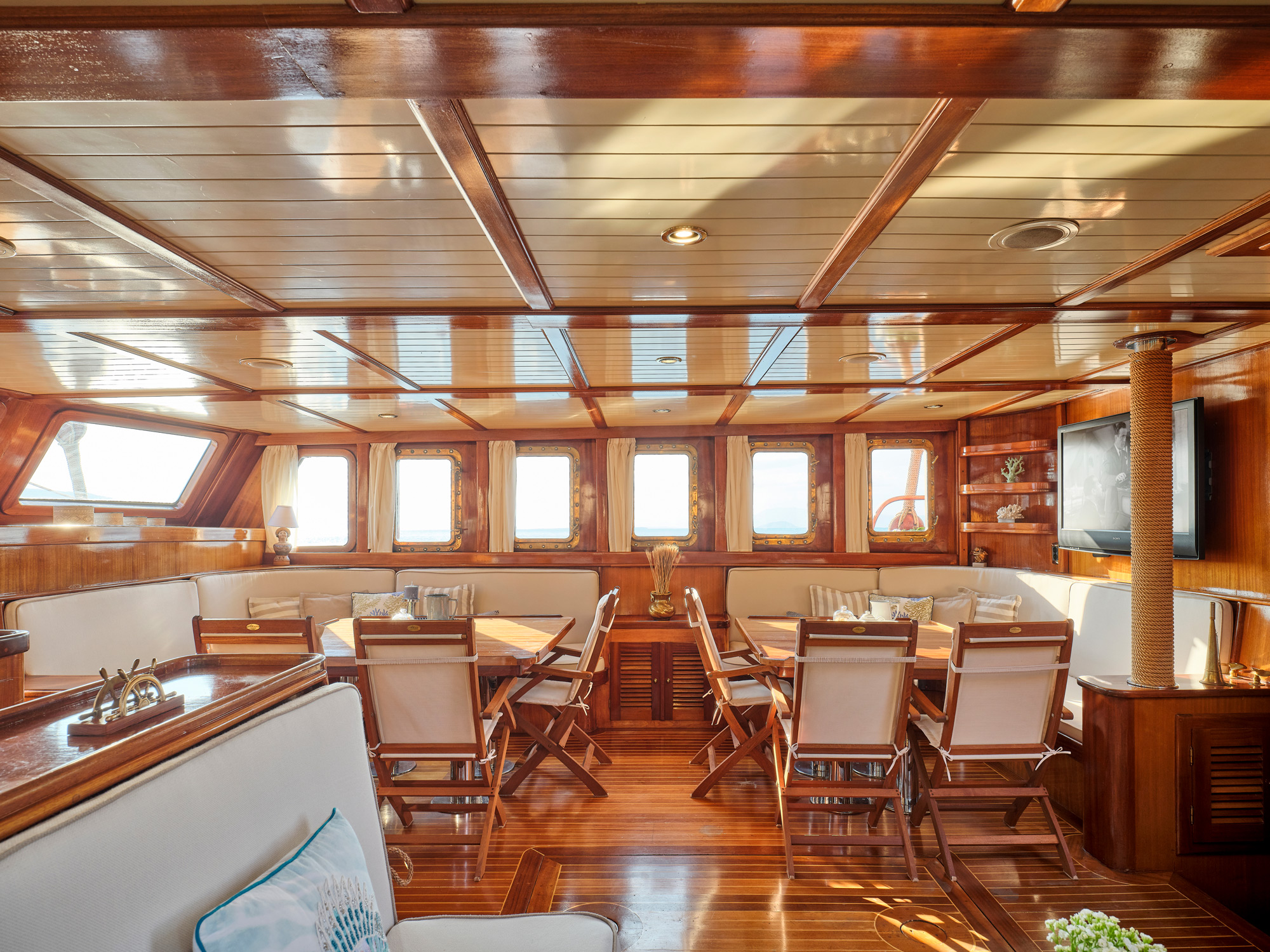 On the port side, 2 formal dining tables seat all 12 guests with room to spare, on the starboard side a built in lounge and coffee table invite guests to relax in comfort. A flat screen TV and audio system are available for indoor entertainment.