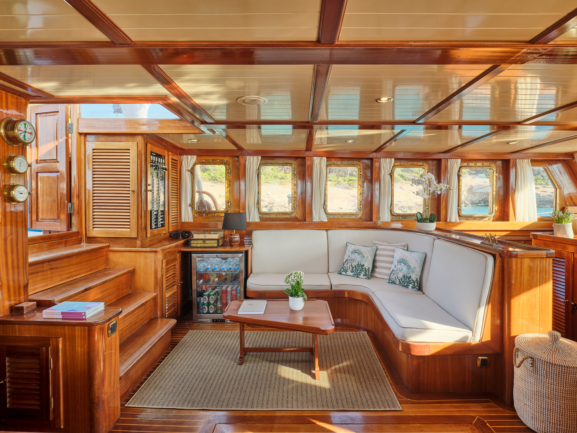 Aboard MYRA, the salon is in the raised deck house, large ports allow ample natural light and great viewing.