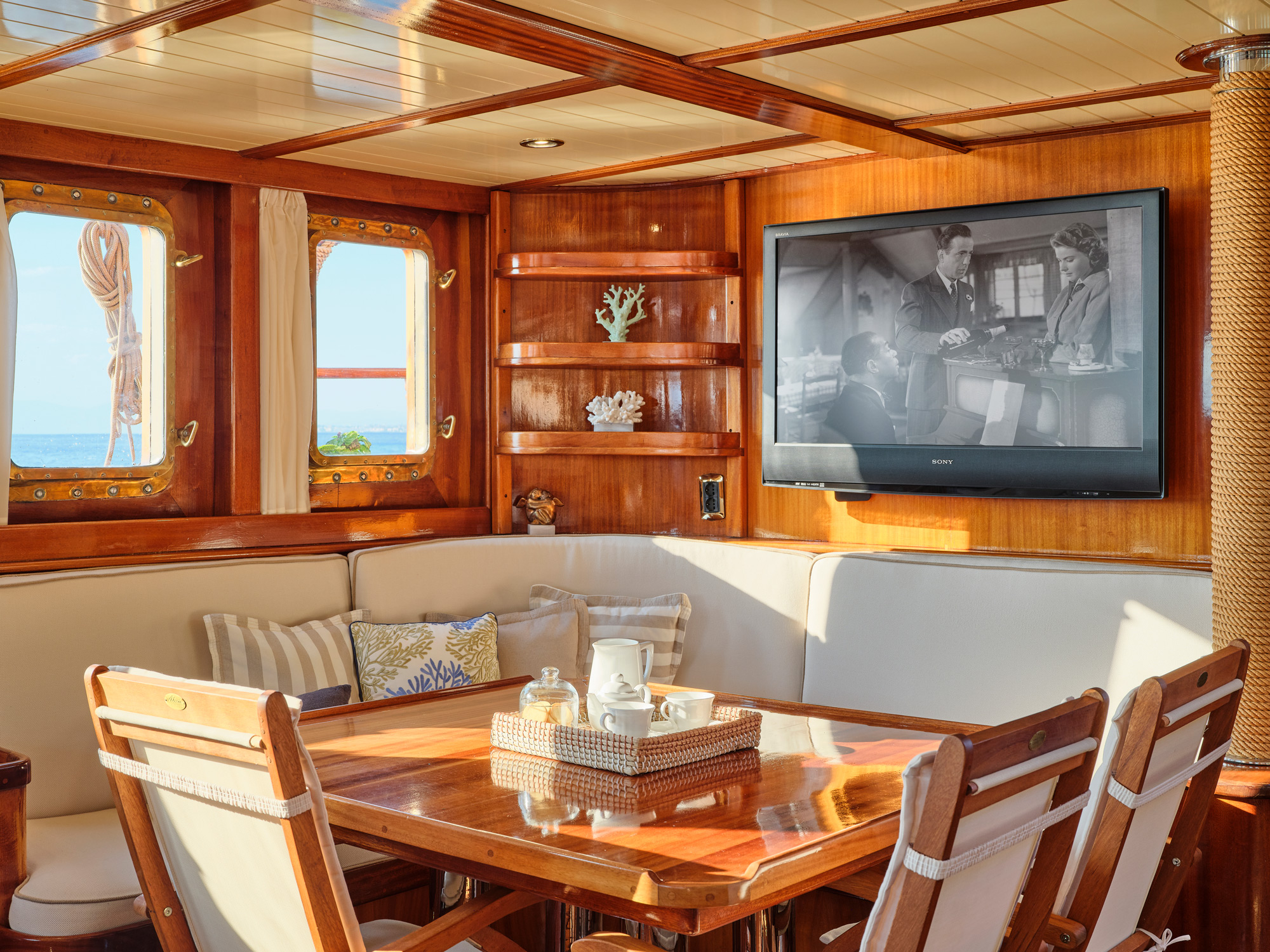 Exterior living on this beautiful sailing yacht is plenty where the aft deck offers an alfresco dining option, seating and aft facing sun pads, shade from a Bimini cover can be provided. Further sun pads on the foredeck allow everyone to find a place to relax.