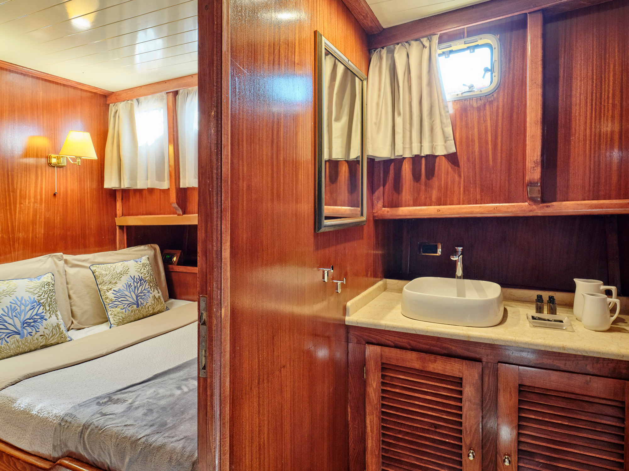 Four double guest cabins are forward of the salon, while 2 twin guests cabins are aft of the salon.