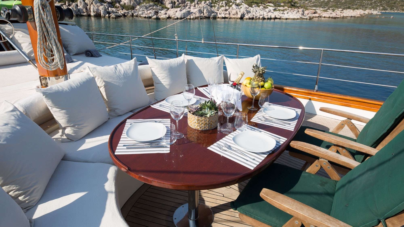 The vessel has plenty of exterior areas to relax and soak up the warm sun. The aft deck is shaded with ample seating and an alfresco dining option.